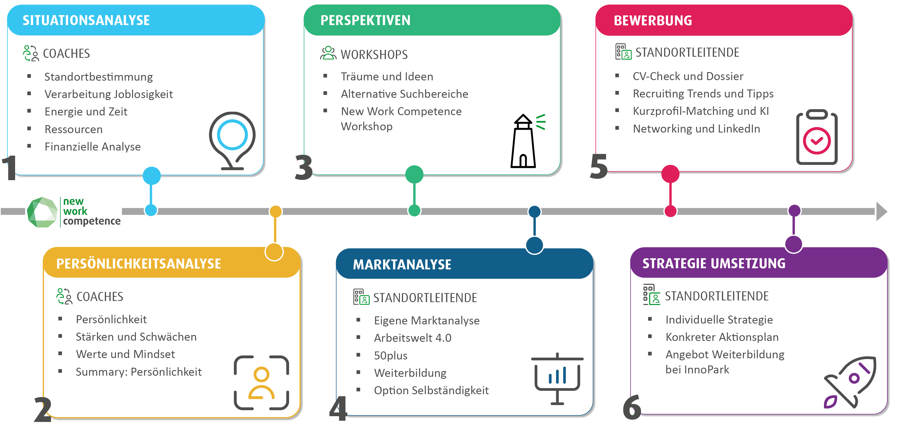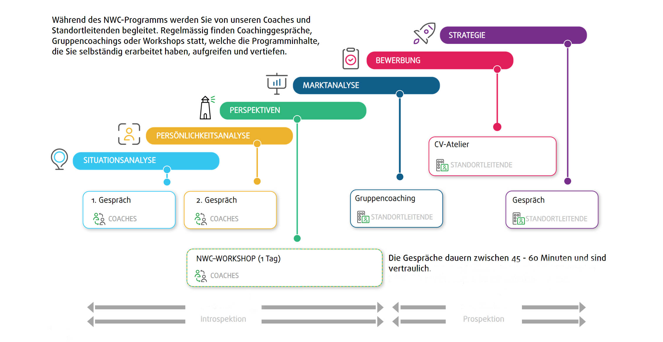 Auf diese Weise entsteht Schritt für Schritt eine individuelle Bewerbungsstrategie mit konkretem Plan für die Umsetzung. So gerüstet gehen die Teilnehmenden das Programm und ihre Bewerbung mit der nötigen Klarheit an, die ihnen ganz neue Aussichten für eine erfolgreiche Stellensuche und einen passenden Job verspricht.