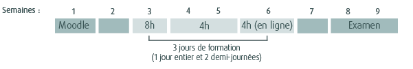 Un investissement individuel est nécessaire avant et après chaque rencontre : 20h de travail en plus des 16h de formation. Le processus de certification dure environ 8 à 9 semaines, dont la répartition du travail se présente ainsi :